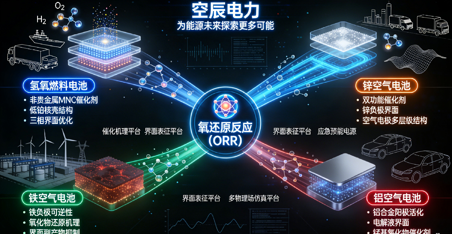 金属空气电池是下一代能源技术的战略高地。空辰电力聚焦氢氧燃料电池与锌、铝、铁基空气电池四大方向,从氧还原反应(ORR)这一核心科学问题出发,以前瞻性研发布局多元技术路线。